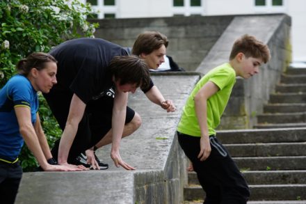 Dies bietet sich übrigens auch an, wenn ihr noch keine Klimmzüge könnt. So könnt ihr es euch selbst schwerer machen in dem ihr die Position der Beine auf dem Boden zu euch verändert.